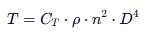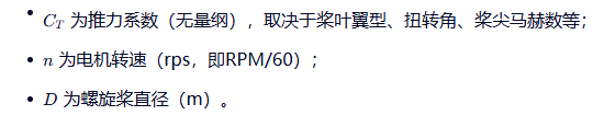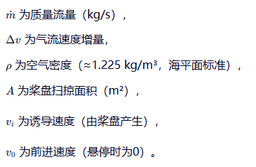 推力(Thrust, 单位:牛顿 N)源于螺旋桨旋转时对空气施加的向下动量变化,根据动量理论,理想状态下可简化为: